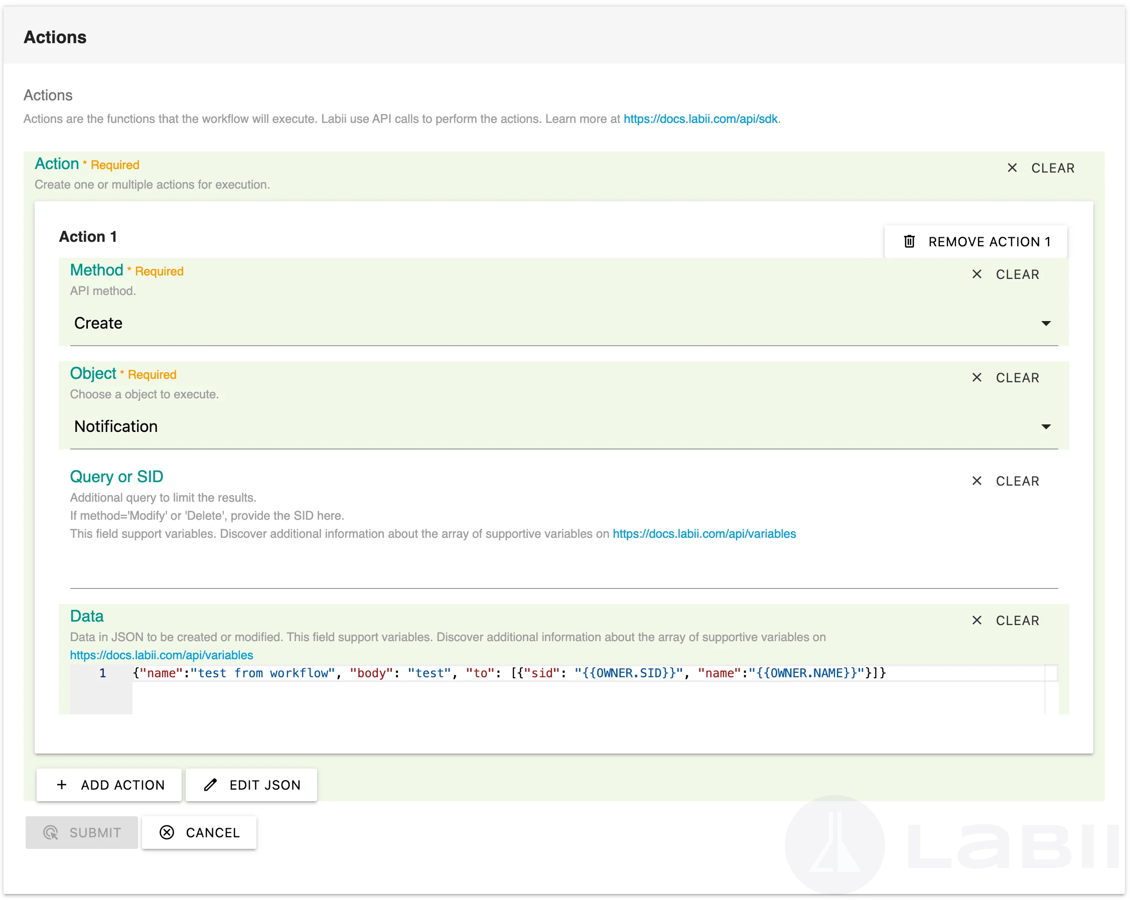 Actions are the functions that the workflow will execute. Labii use API calls to perform the actions. Learn more at <https://docs.labii.com/api/sdk>.