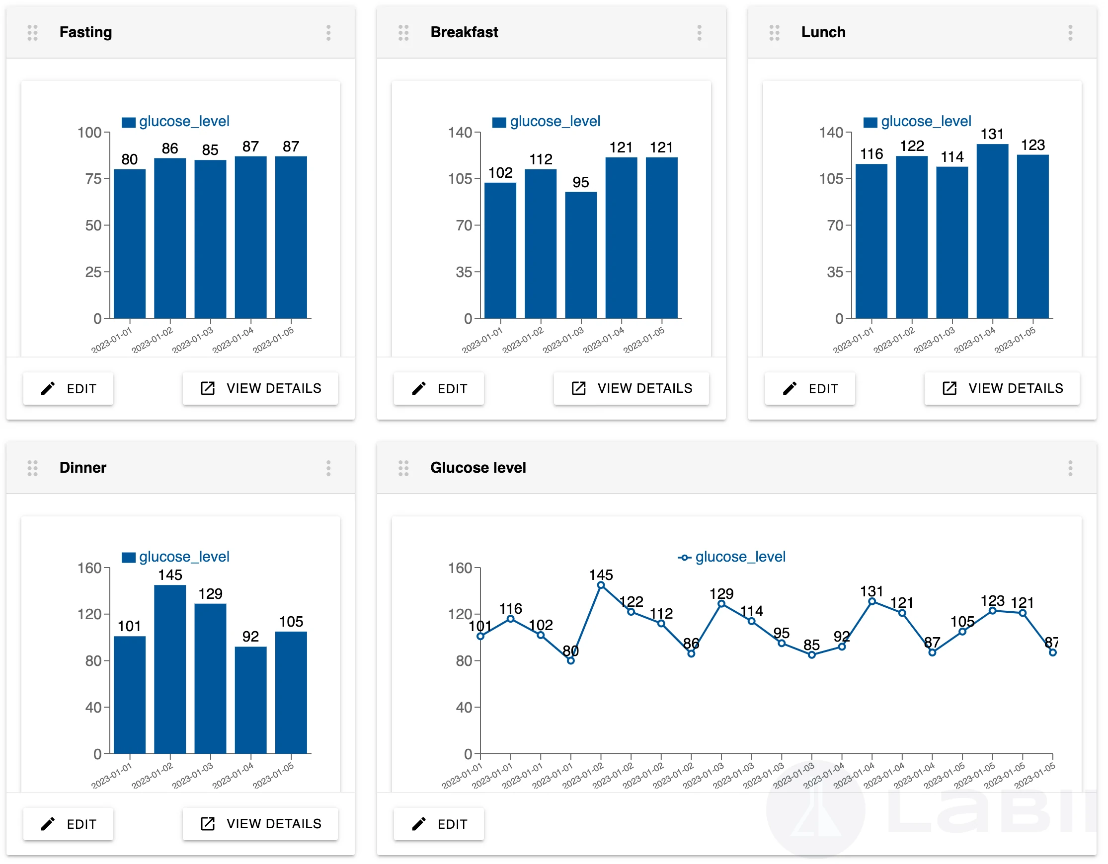 You can monitor the glucose level overtime with [dashboard widgets](https://docs.labii.com/widgets/dashboard-widgets). In default, Labii creates the charts for Fasting, Breakfast, Lunch, Dinner and overall Glucose level. Click the Dashboard tab of the glucose list view to see the charts.