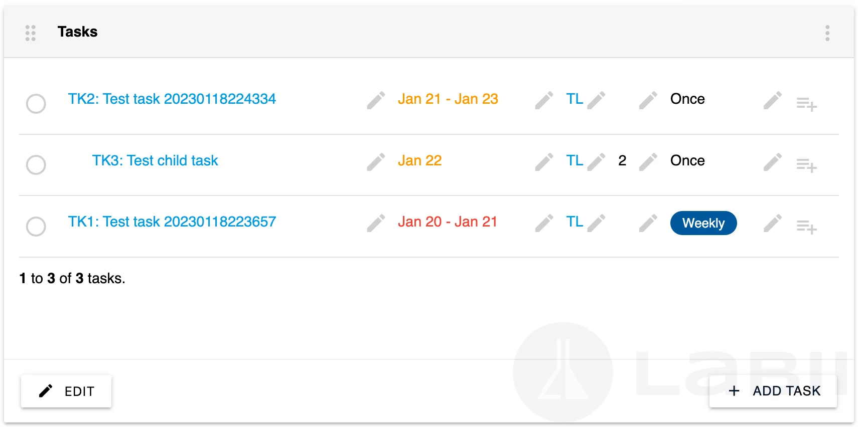 Labii's task management feature includes a list view that allows users to easily manage their tasks. To provide a familiar experience to other vendors in the market, Labii also includes a tasks widget in the dashboard, which allows users to quickly complete tasks with a simple click and view subtasks indented under the parent task.