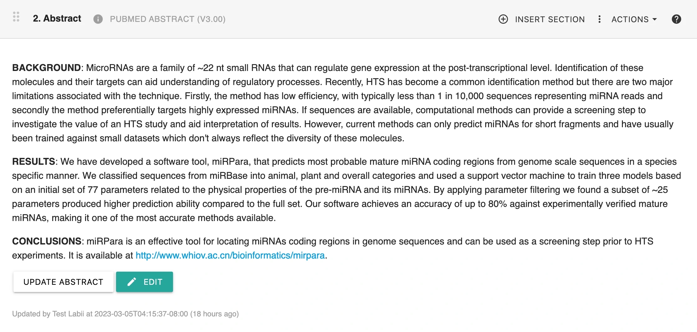 If you have changed the PMID and need to pull down the correct abstract, click the Update abstract button.