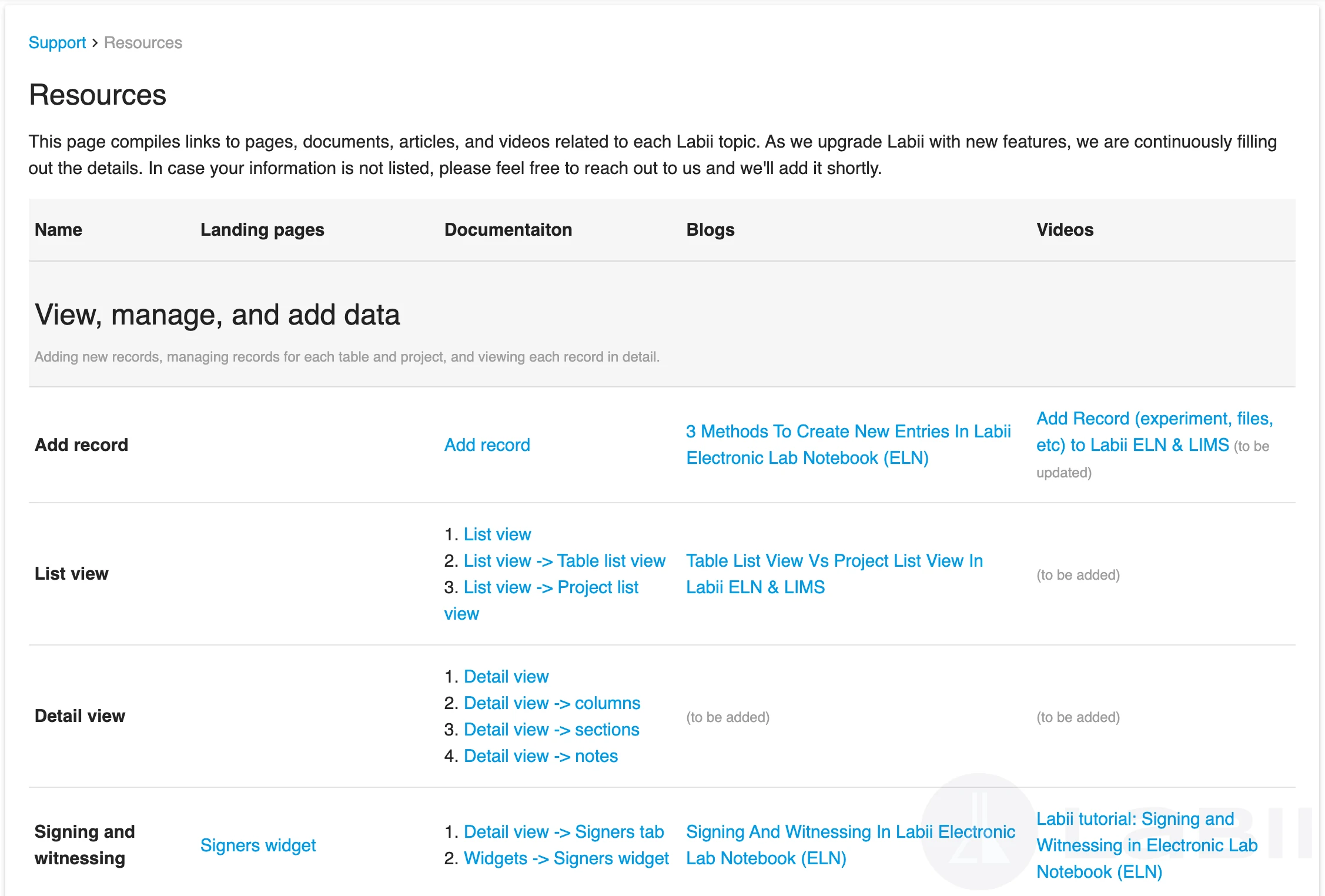Labii strives to provide comprehensive resources for users to make the most of the platform. To achieve this goal, we have created a page that compiles links to all relevant resources related to each Labii topic. This includes pages, documents, articles, and videos that provide detailed information and guidance on the use of Labii's features. We understand that as we continue to upgrade and add new features to the platform, there may be information that is not yet listed. Therefore, we encourage users to reach out to us with any questions or suggestions for additional resources, and we will work to add them promptly. Our commitment to providing up-to-date and thorough resources ensures that users can confidently navigate and utilize all that Labii has to offer.