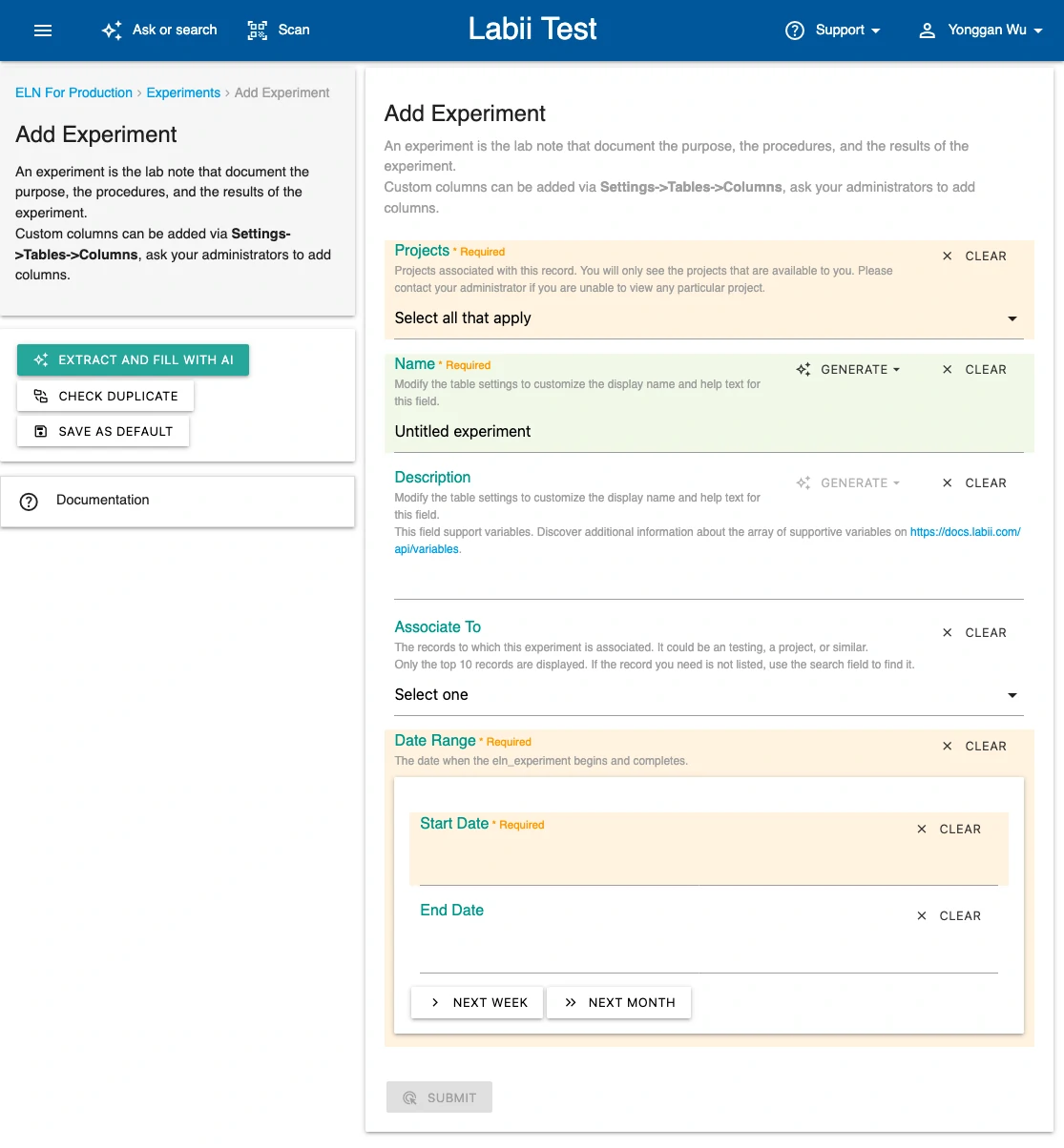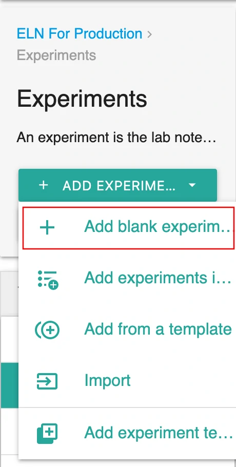 Select a table (e.g., *Experiments*, *Samples*) to create a blank record.