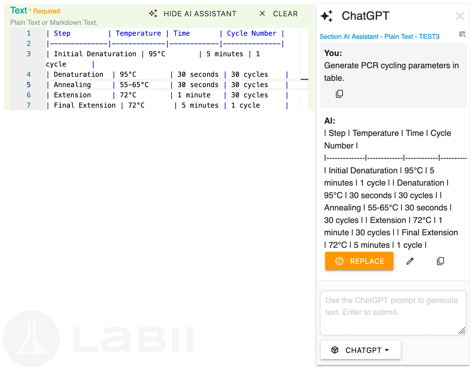3. Click the **Replace** button to update the text with AI-generated markdown